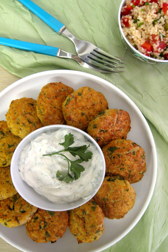 Ρεβιθοκεφτέδες στον φούρνο με ντιπ γιαουρτιού και σαλάτα με πλιγούρι