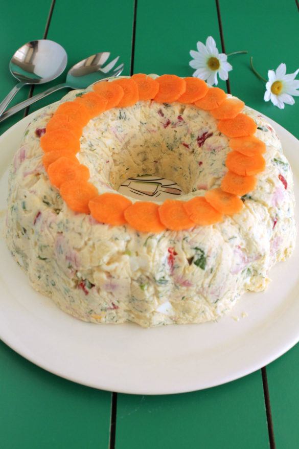 - Την επόμενη μέρα αφαιρούμε τη μεμβράνη της επιφάνειας και τοποθετούμε τη φόρμα σε πιατέλα. Ξεφορμάρουμε τη σαλάτα και με προσοχή αφαιρούμε και το άλλο κομμάτι μεμβράνης.