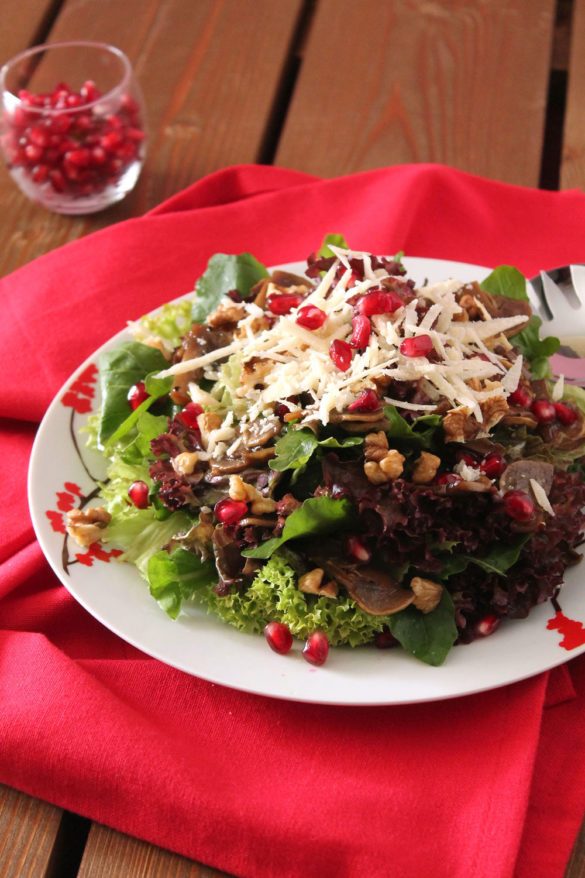 Η πράσινη σαλάτα με μανιτάρια, καρύδια, ρόδι και παρμεζάνα είναι γεμάτη χρώματα, υφές και γεύσεις. Και είναι ιδανική για το χριστουγεννιάτικο τραπέζι.
