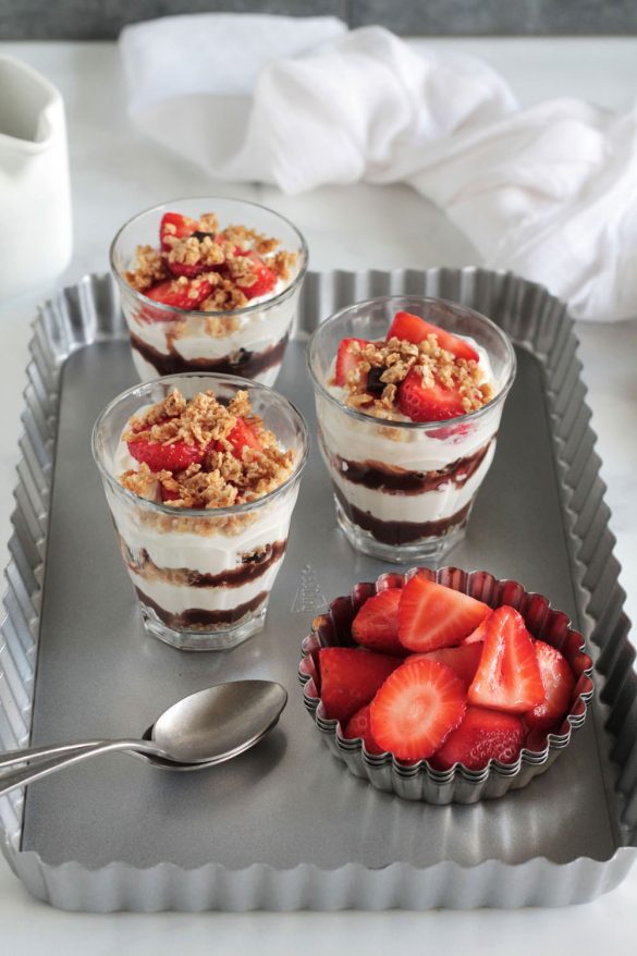 Αυτά τα παρφέ με γιαούρτι έχουν διαδοχικές στρώσεις από γκρανόλα, σοκολατένια σος με μερέντα, ανάλαφρη κρέμα με γιαούρτι και φράουλες!